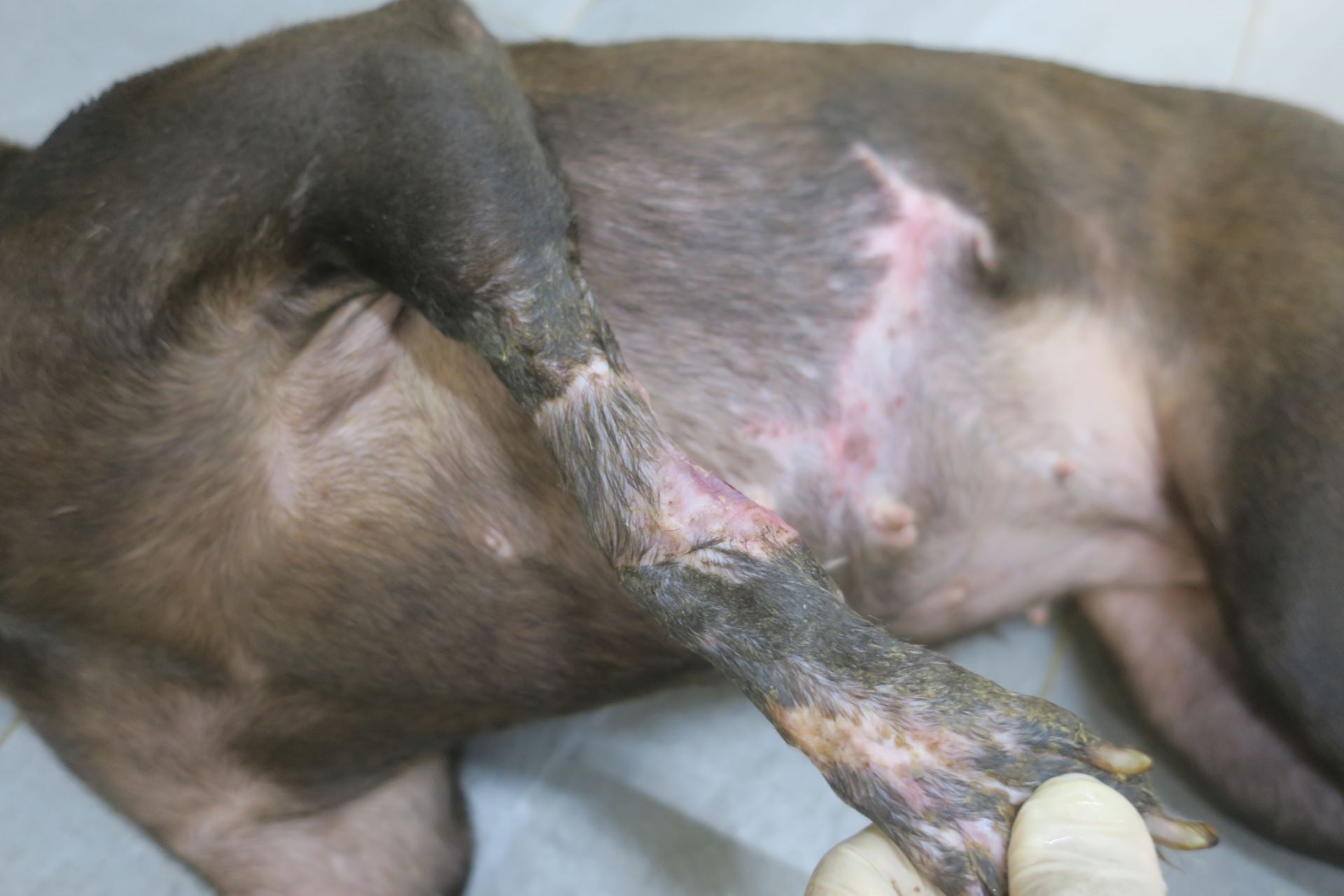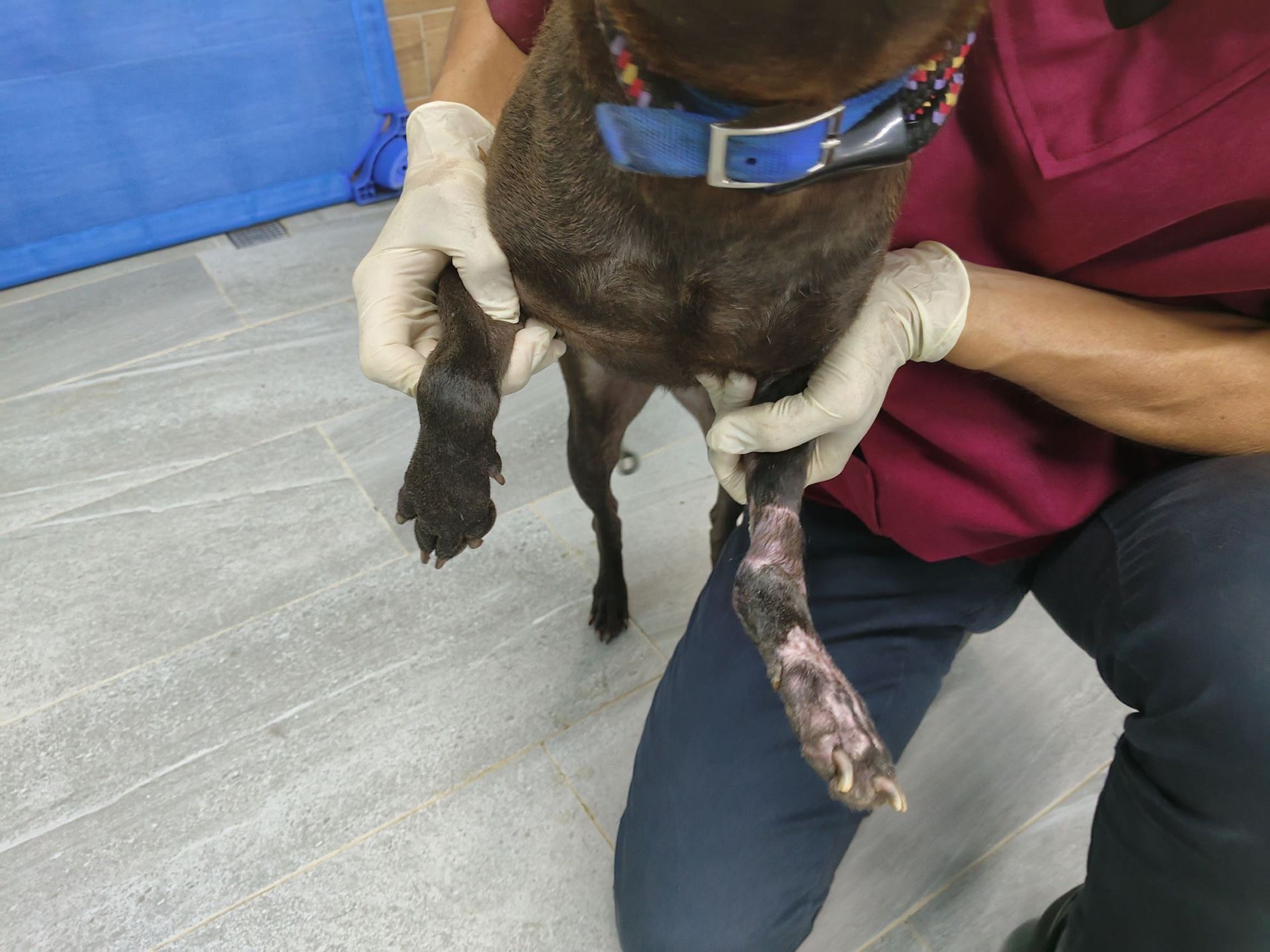 發現沙拉左前腳腕部至腳掌背側有大範圍皮膚缺損與嚴重腫脹。