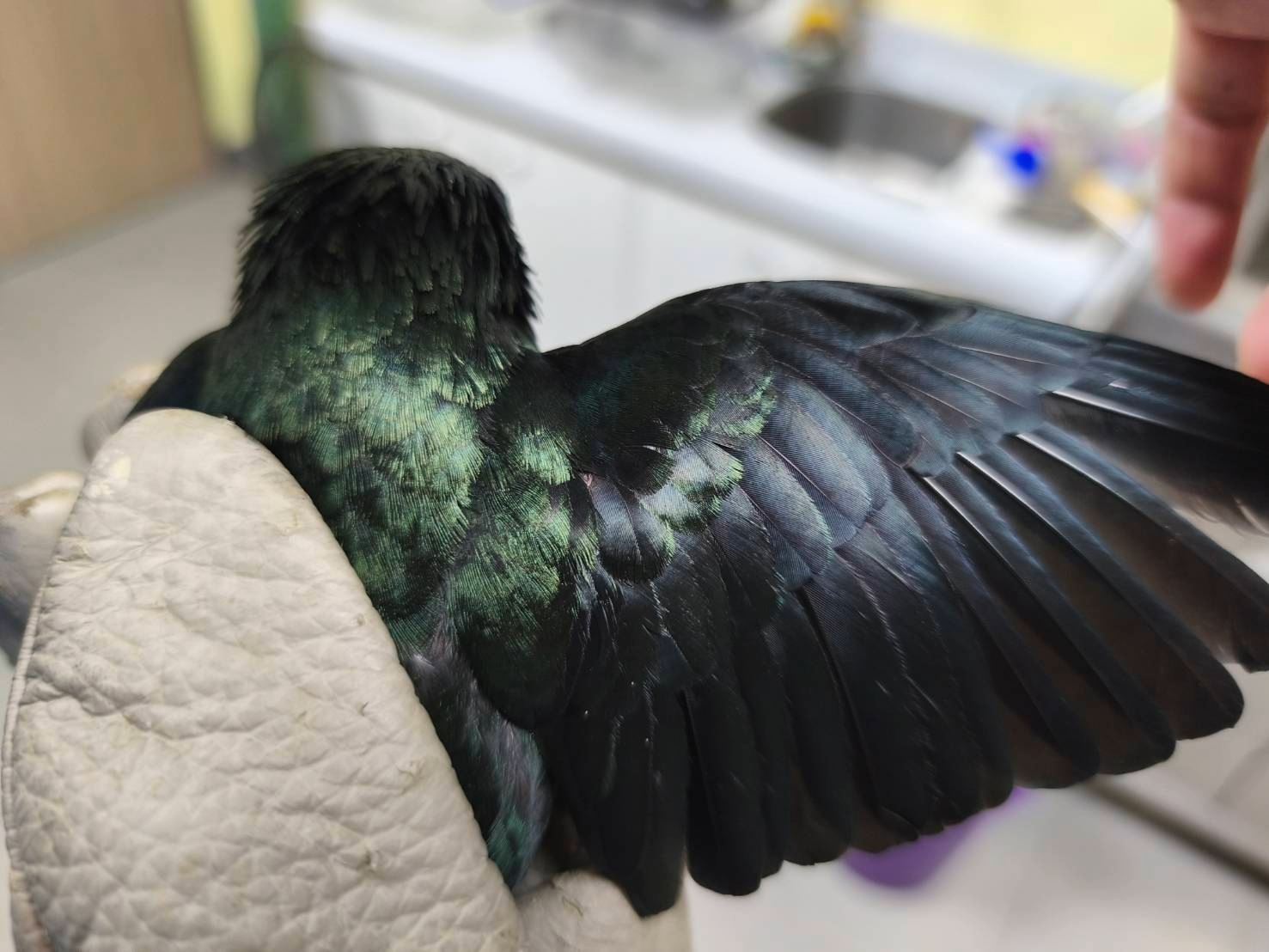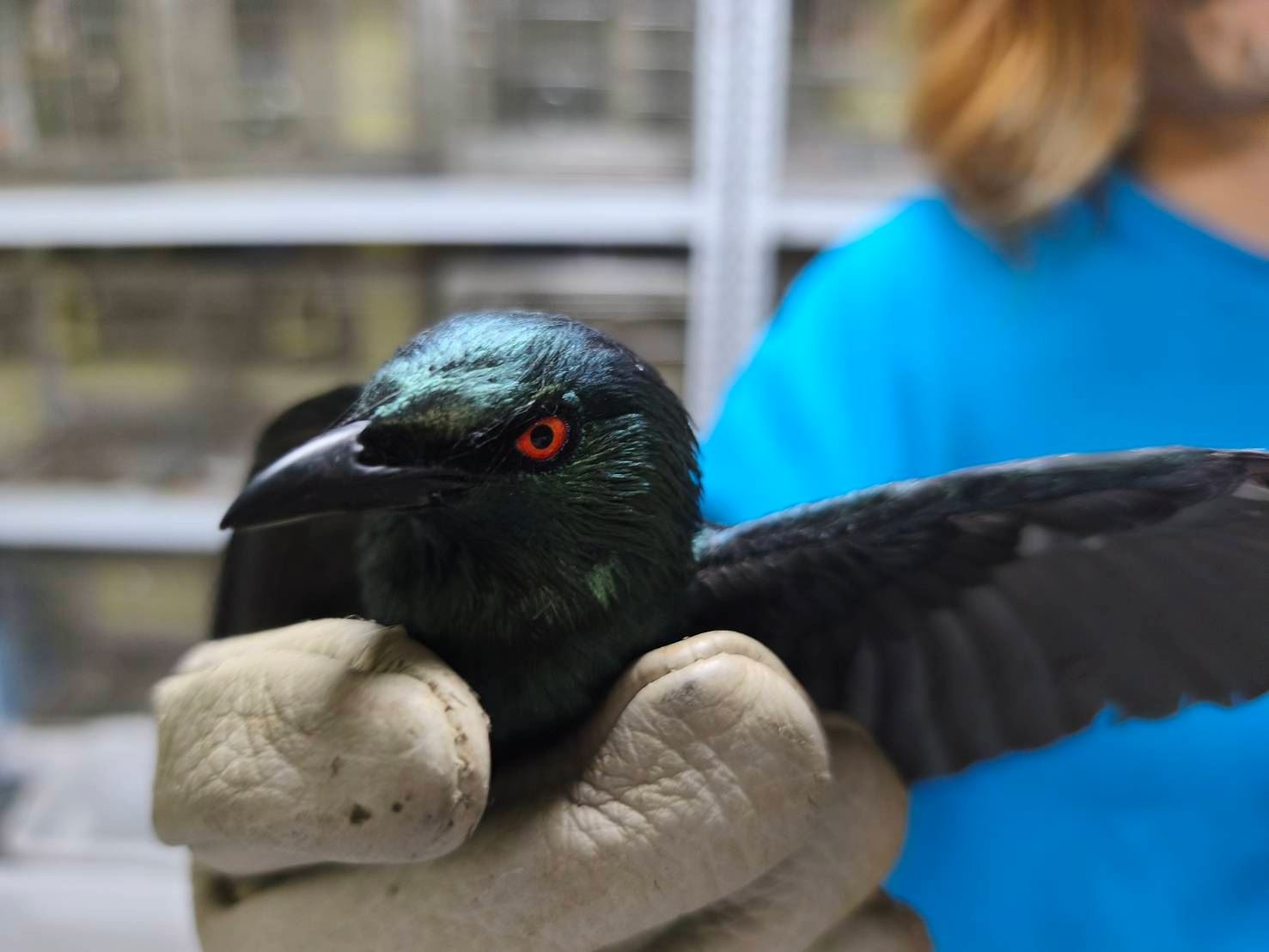 發現一隻外型神秘的鳥類受困,羽毛透著閃亮墨綠光澤、雙眼竟呈現詭異紅光。