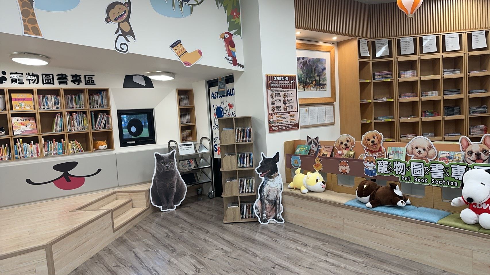 走進寵物圖書專區,映入眼簾的是可愛的大型狗狗玩偶與毛寶貝立體造型設計。