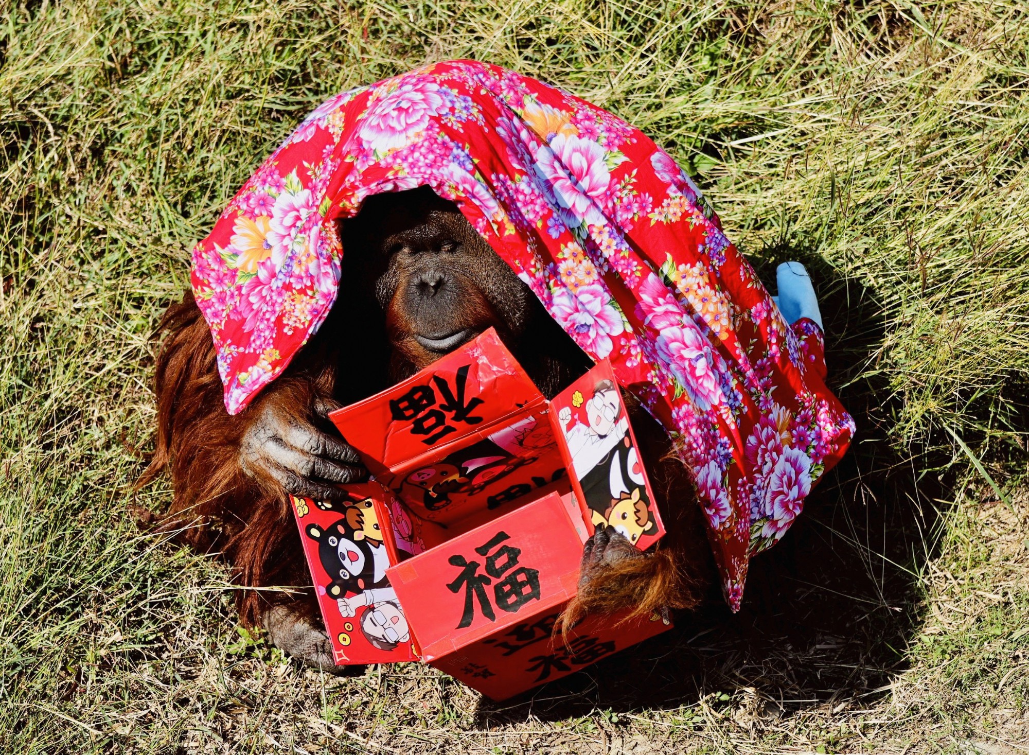此外,紅毛猩猩「阿宏」好奇拆開新年禮盒,並裹上園區志工特製的花布喜氣毛毯。