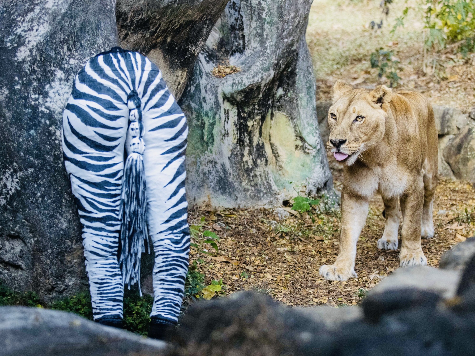 ( 非洲獅「布蕾」觀察斑馬造型臀 圖/高雄市觀光局提供 )