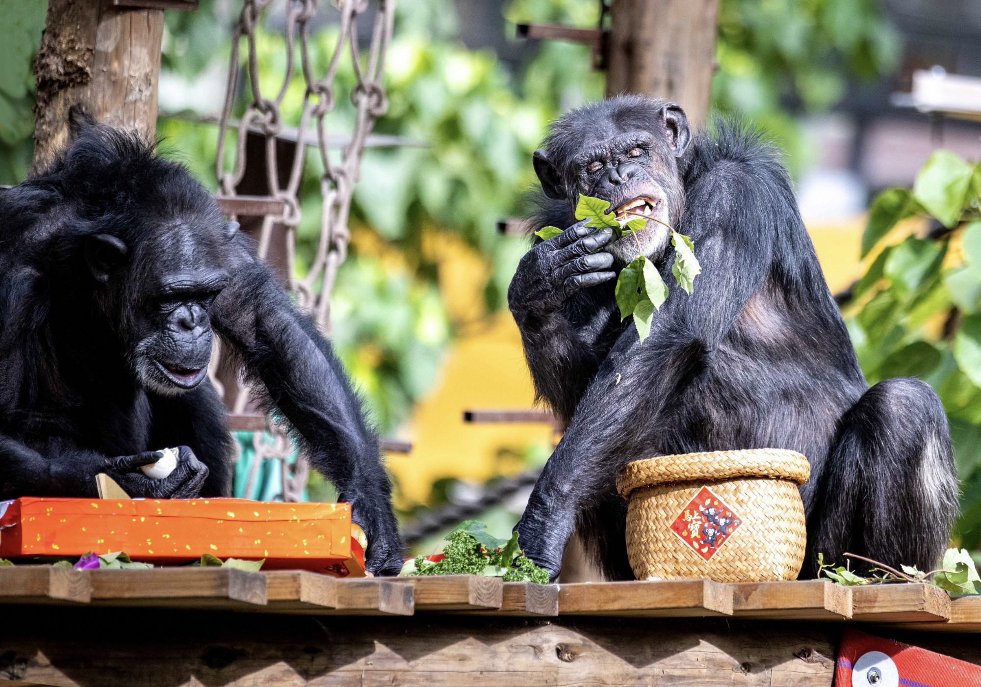 與黑猩猩「美珍」及「曼華」優雅享用九宮格蔬果盒及蔬果竹簍佳餚的畫面成強烈對比。