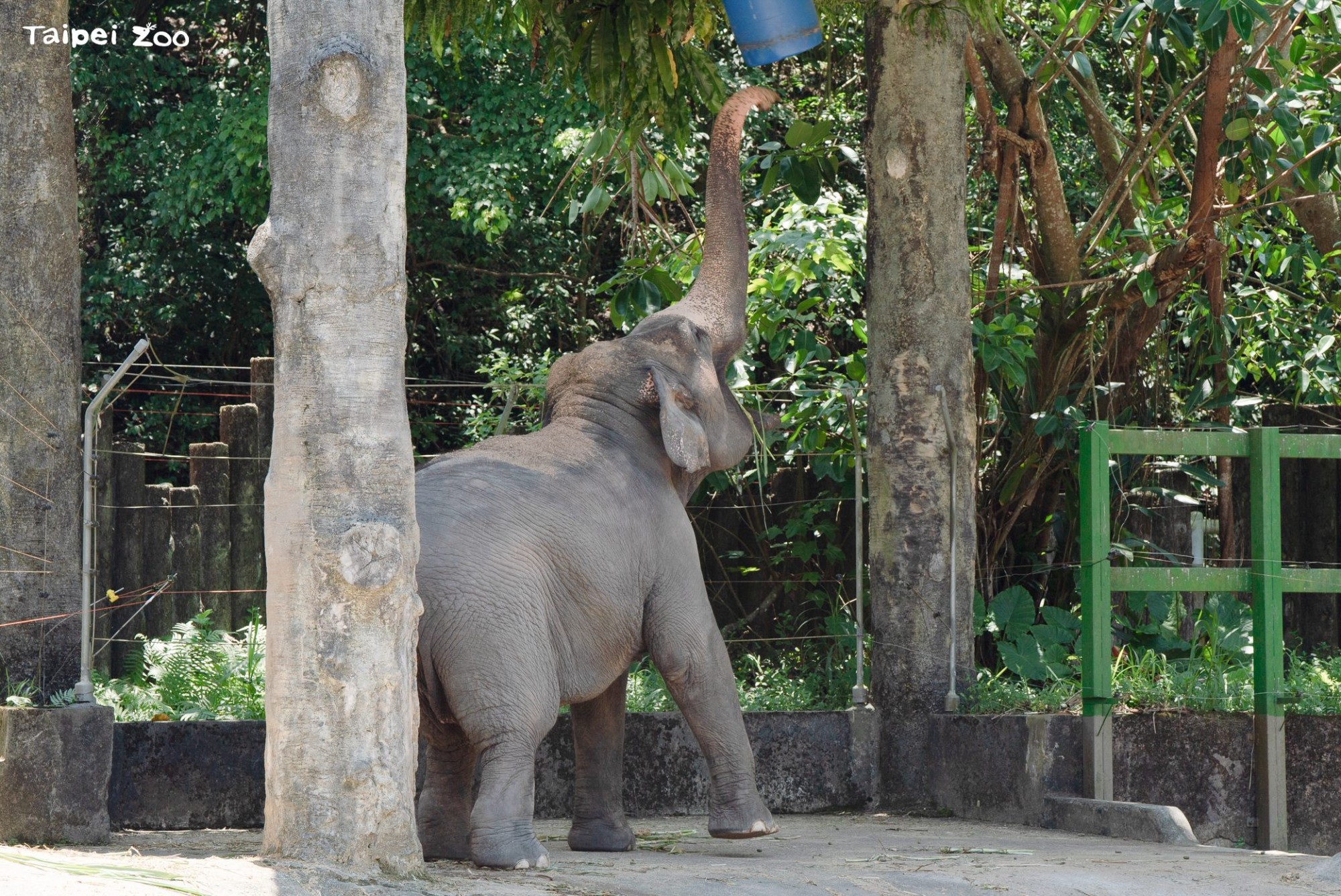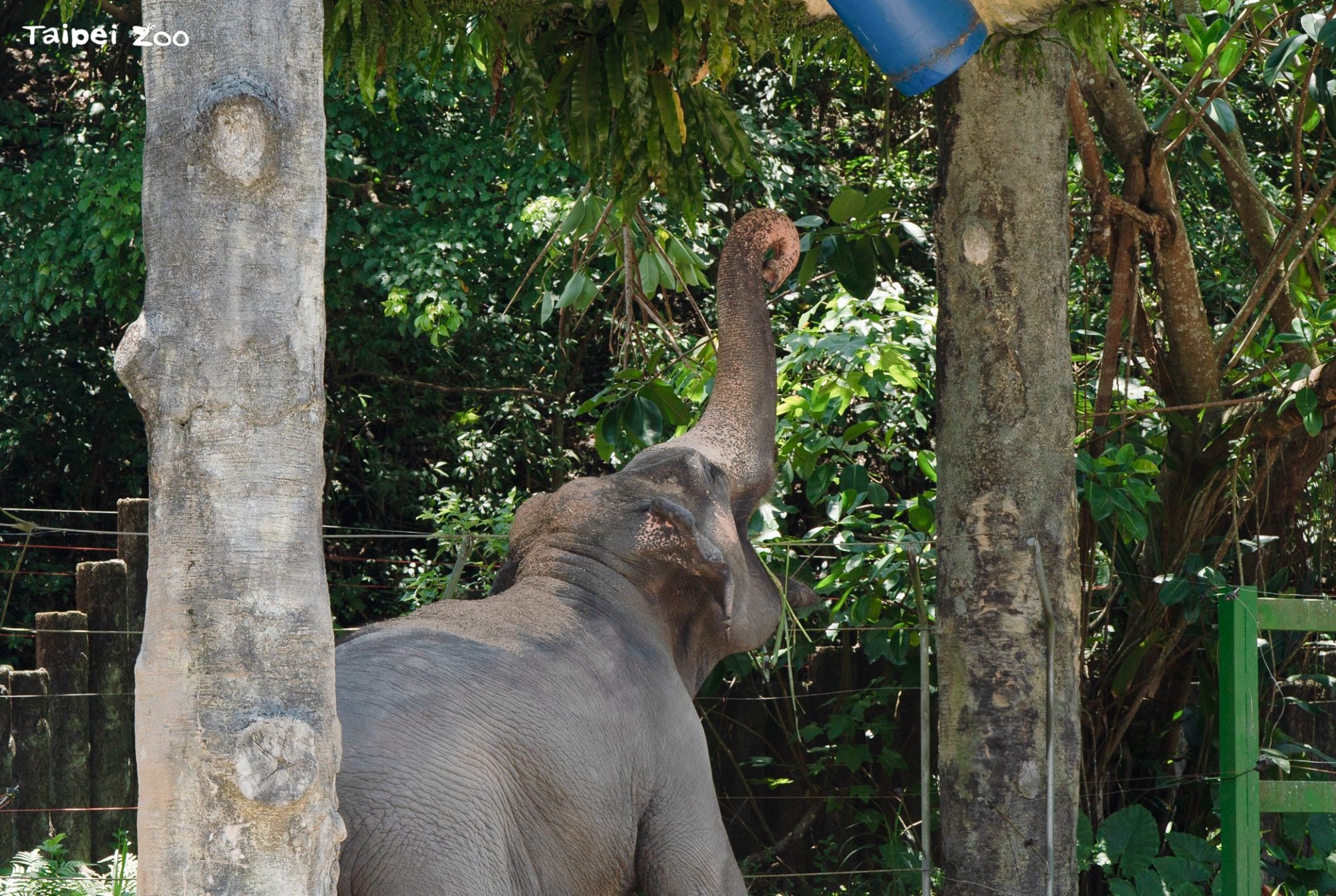 走進臺北市立動物園的熱帶雨林區,細心的遊客可能會注意到亞洲象活動場裡有一座高高的涼亭,亭子上方掛著一個神祕的藍色桶狀物。