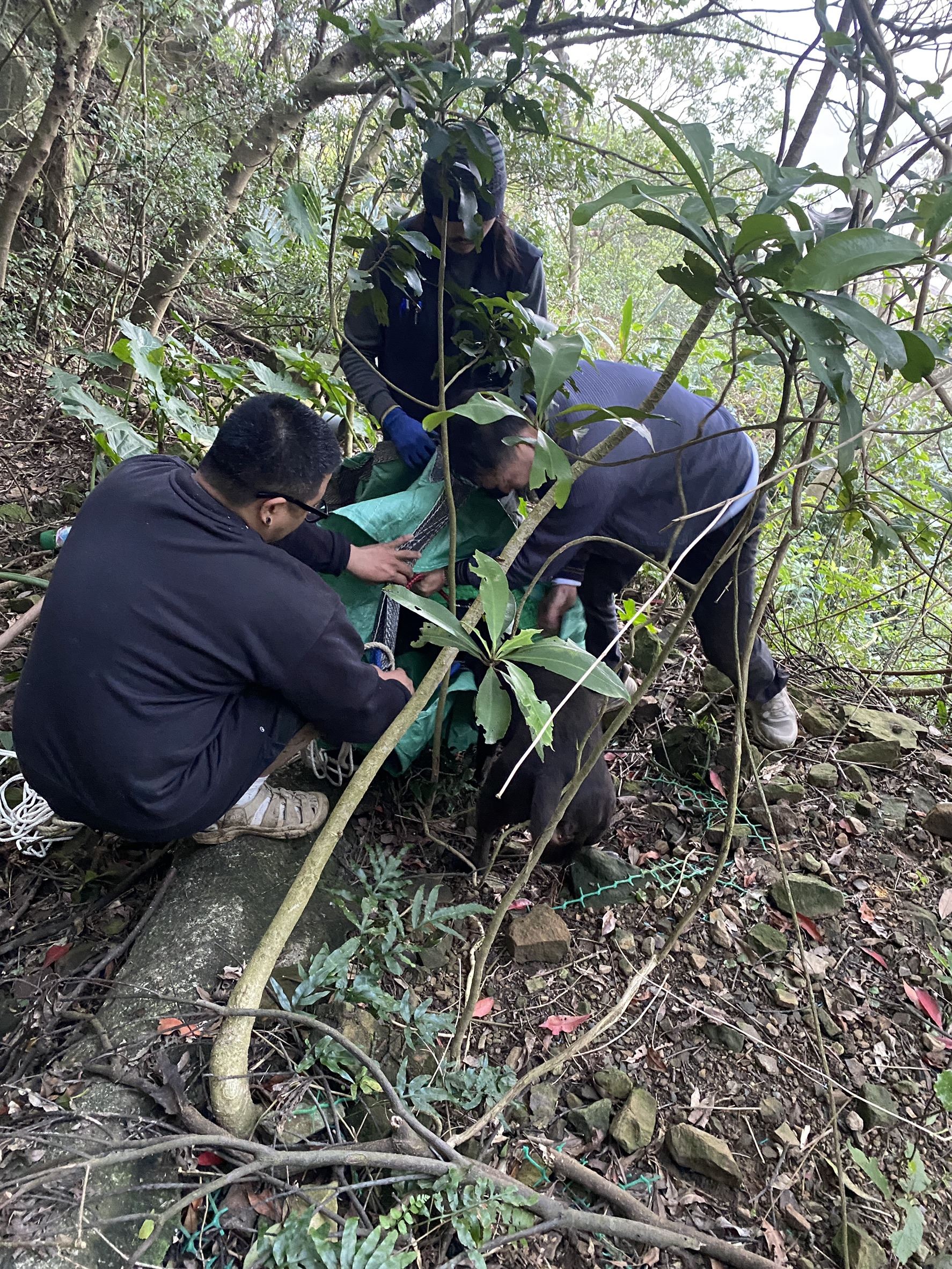 以較穩妥的方式進行救援作業,並使用尼龍布包覆犬隻,避免在搬運過程中因掙扎或滑落而造成二次傷害。