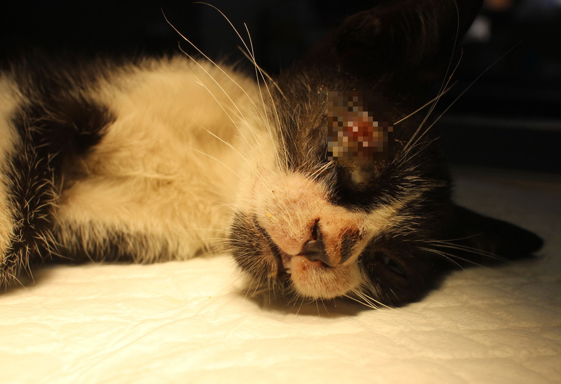 日前,新北市政府動物保護防疫處接獲通報,指出汐止區福德二路路旁有一隻小黑白貓嚴重受傷。
