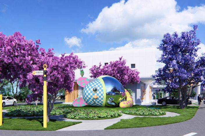 未來民眾一走進園區,首先映入眼簾的將是公共藝術作品「萌獸」與生機盎然的迎賓花園。