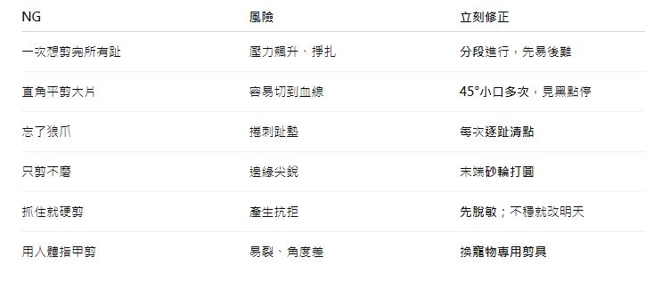 剪趾甲的關鍵不在「一次剪多少」,而在每一次都留下好經驗:工具鋒利、45°小口修、看到白粉停、黑點即停,搭配脫敏+高價值獎勵。