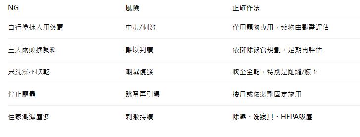 - 止癢產品:僅用寵物專用保濕噴霧/修護霜;避免人用類固醇或酒精。